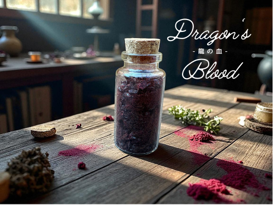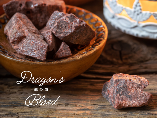 ドラゴンズブラッドには、香りを焚くことで空間や心身を「浄化」する、または精神を落ち着かせ「グラウンディング」する効果があると言われています。樹脂香として古くから用いられ、ヨガや瞑想の際に邪気を祓う目的でも使われます。強力な魔除けや浄化を思わせる使用後のべっとりとした血液感がたまりません。